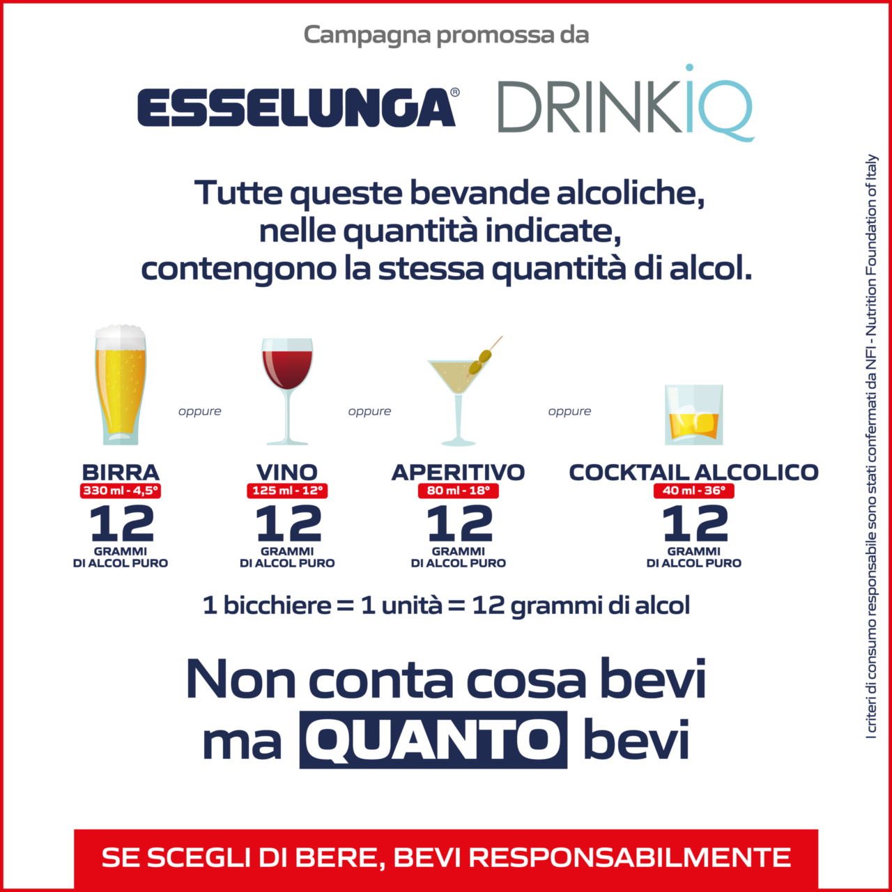 Uno degli obiettivi principali di DrinkIQ è contribuire a superare preconcetti ancora diffusi, tra cui l’associazione tra tipologia di bevanda e quantità di alcol. La campagna si configura così come uno strumento informativo rivolto al consumatore, volto a promuovere una comprensione più chiara e oggettiva del consumo: diverse quantità di vino, birra e spirits contengono infatti la stessa quantità di alcol. Questa iniziativa risulta particolarmente rilevante per lo stile di vita italiano dove il consumo di alcol è legato alla dimensione sociale.